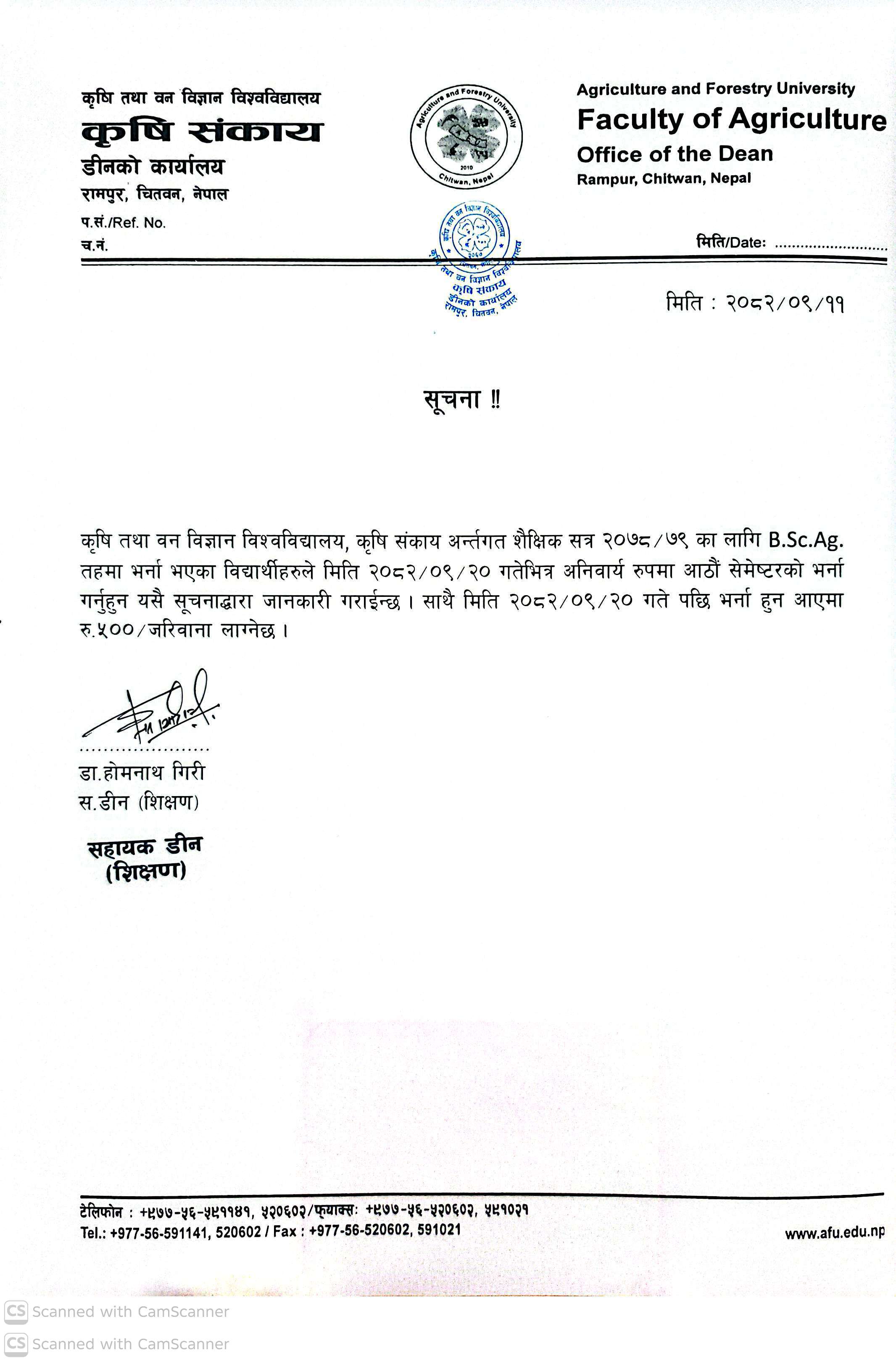 Admission Notice B.Sc. Ag 8th Sem, Academic Year 2078/2079