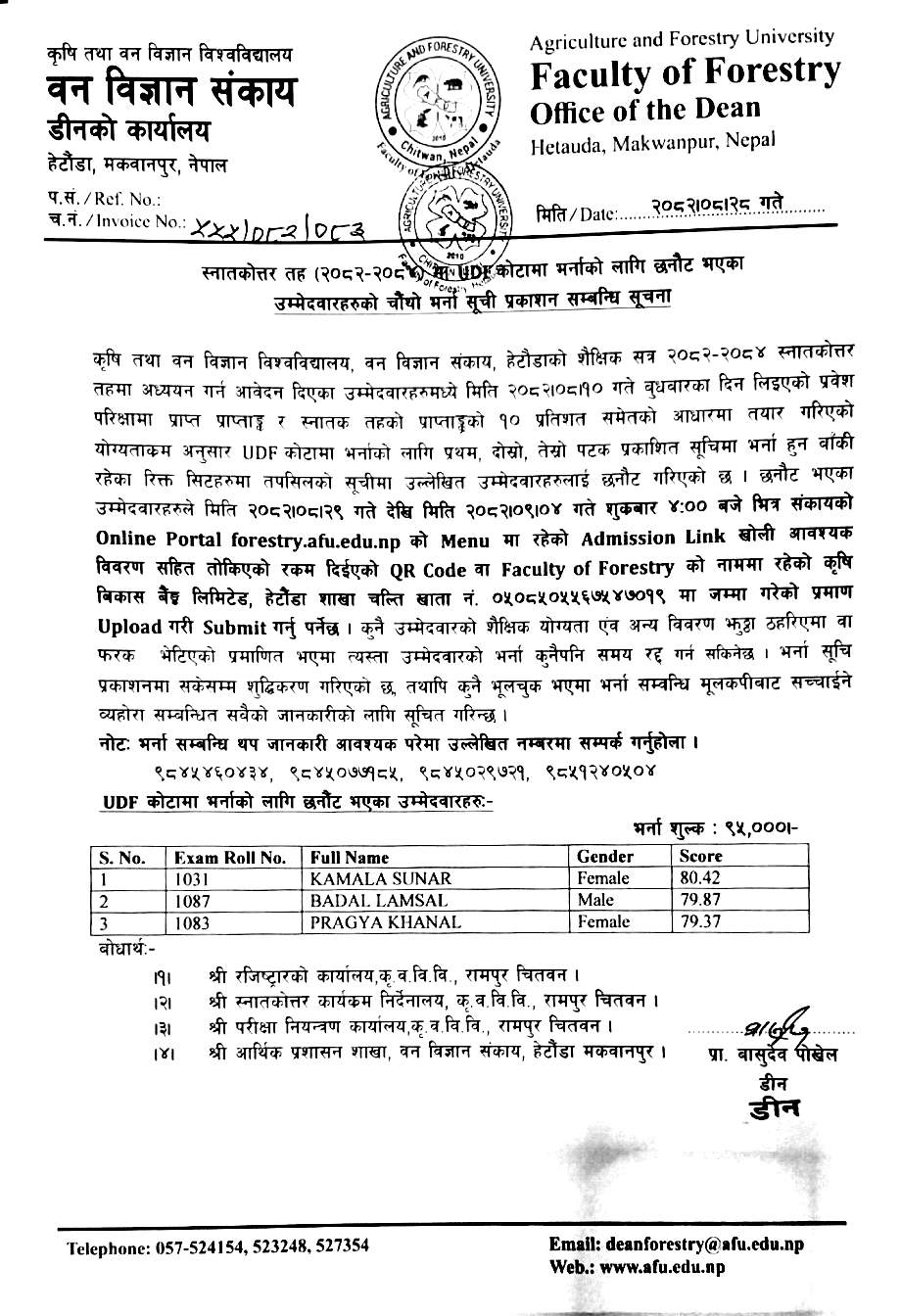 Admission Notice UDF 4th List M.Sc. Forestry 2082