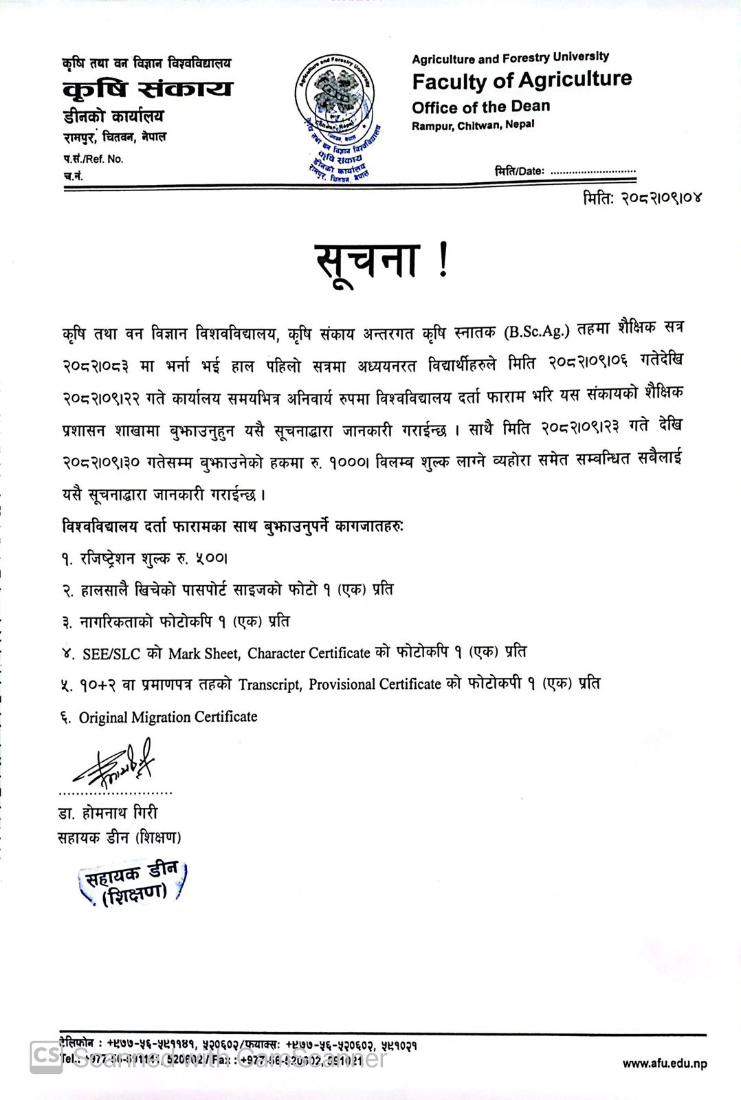 Admission Notice UDF 5th List M.Sc. Forestry 2082