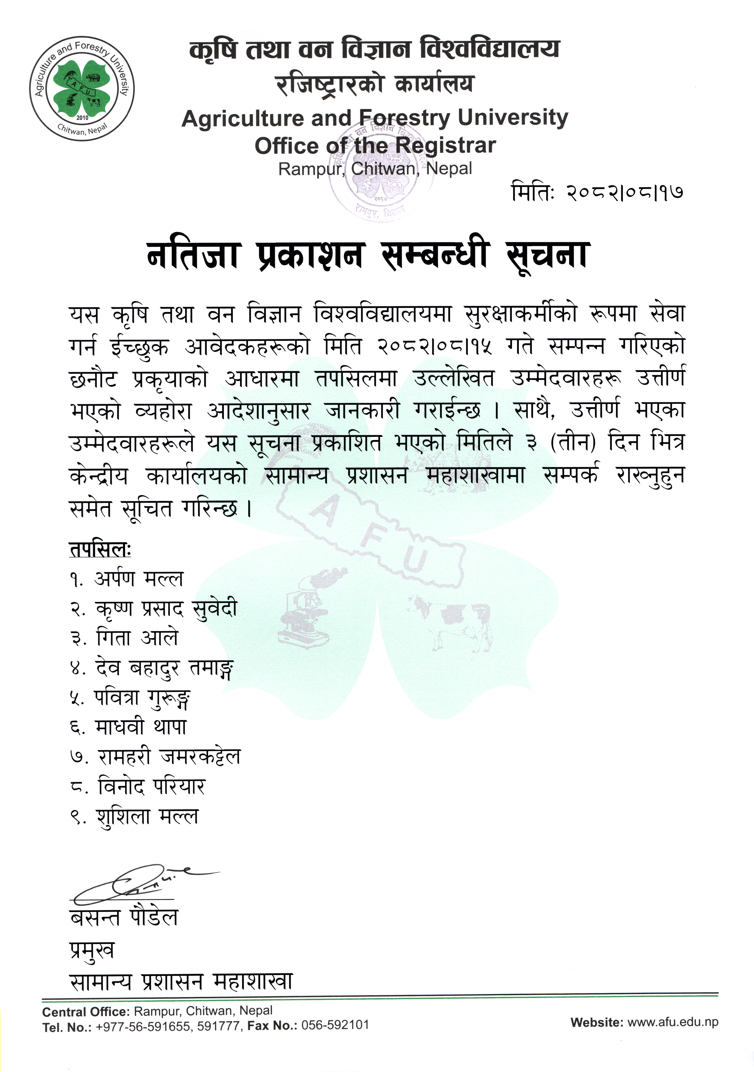 Admission Notice UDF 1st List M.Sc. Forestry 2082