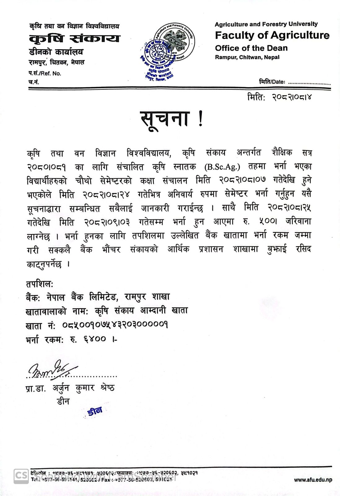 B.V.Sc & A.H. कार्यक्रममा FDF र B.Sc. Fisheries कार्यक्रममा रिक्त रहेका सिटहरुमा भर्ना सम्बन्धी सूचना