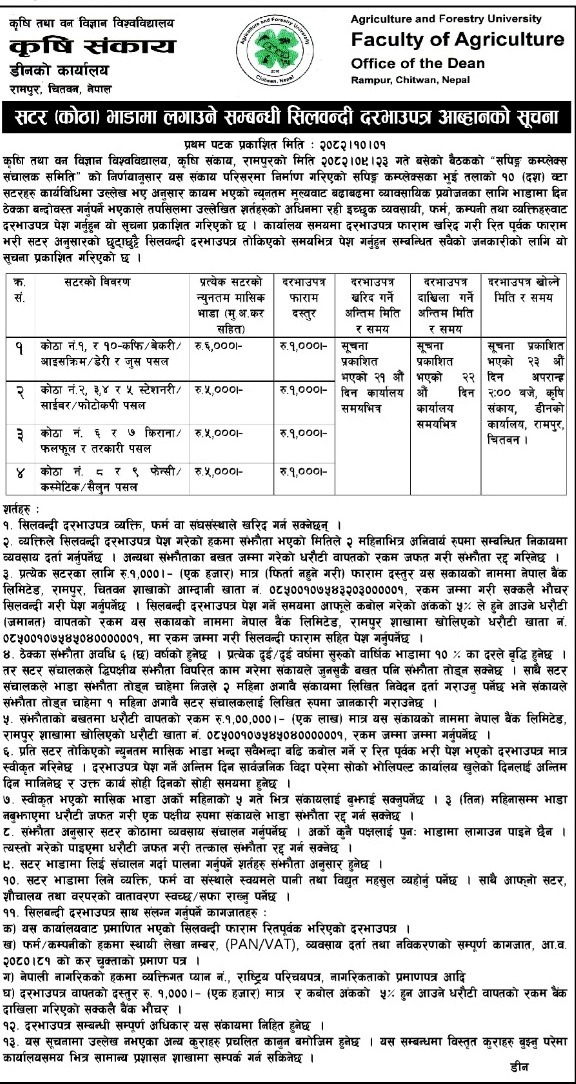 सटर (कोठा) भाडामा लगाउने सम्बन्धी सिलवन्दी दरभाउपत्र आव्हानको सूचना